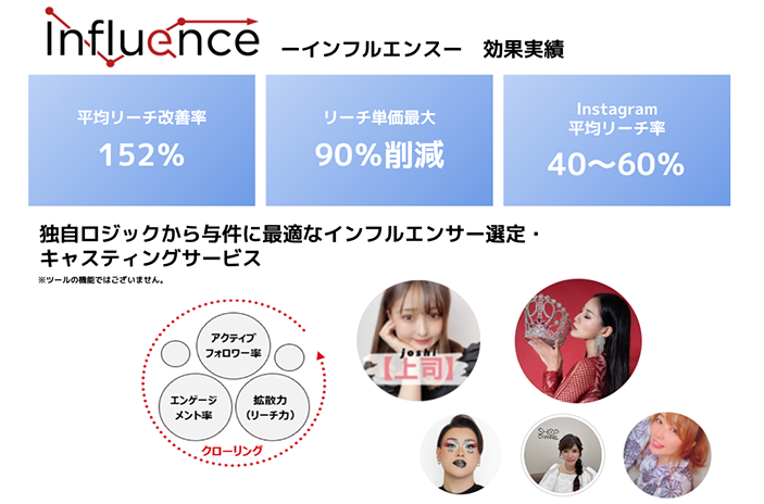 ※「Influence(インフルエンス)」は当社独自のインフルエンサー選定アルゴリズムにより、与件に最適なインフルエンサーを選別、ベストな施策提案までするキャスティングサービスです。